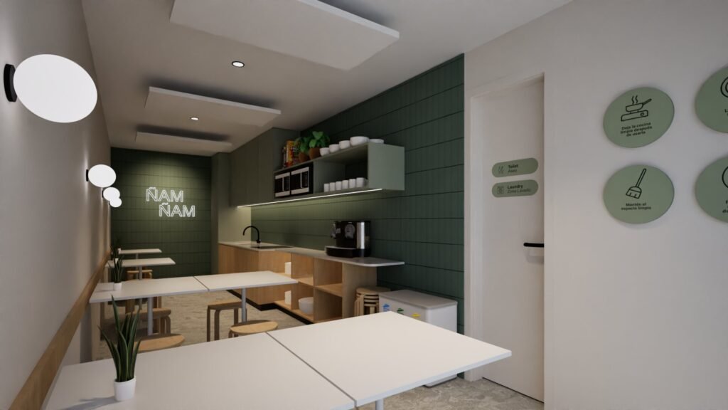 Se potencia la entrada principal, vestíbulo y recepción. Se genera un gran salón donde puedan convivir los usuarios, se rediseña un patio interior ajardinado y un office, donde se pueda cocinar y disfrutar de la cocina en compañía.