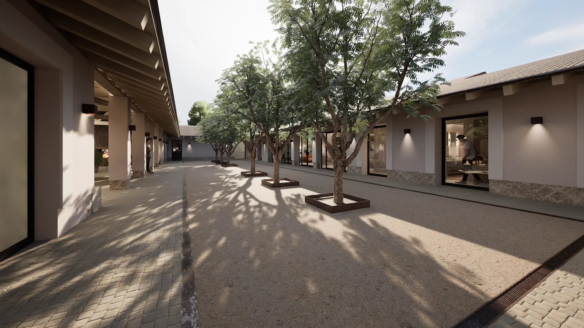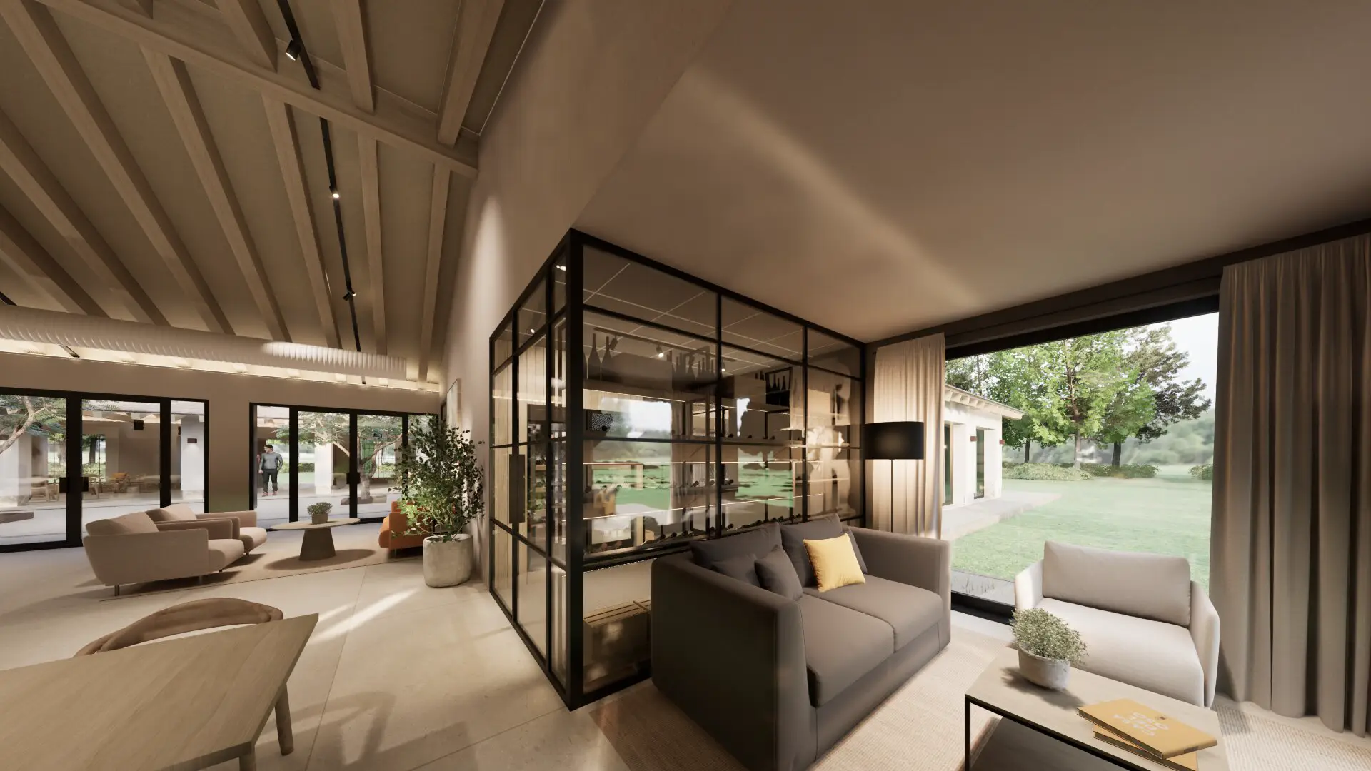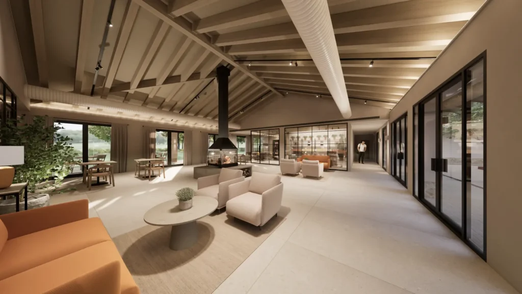 Un patio ajardinado con dos grandes filandones, permite el acceso a cada una de las estancias desde un deambulatorio perimetral, cubierto por el vuelo de la cubierta. Atravesando este patio se llega a un gran salón central que además de servir de salón es un distribuidor de los espacios de vinoteca, colmado, restaurante y aulas de la escuela restaurante. Todas estas estancias, a su vez se abren a las magníficas vistas del mar de pastos de La Moraña.