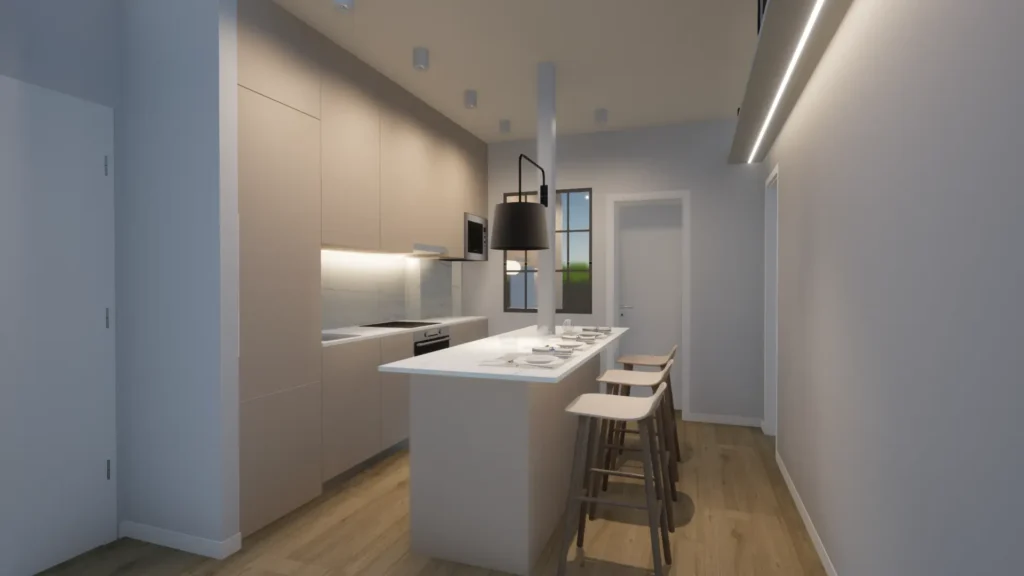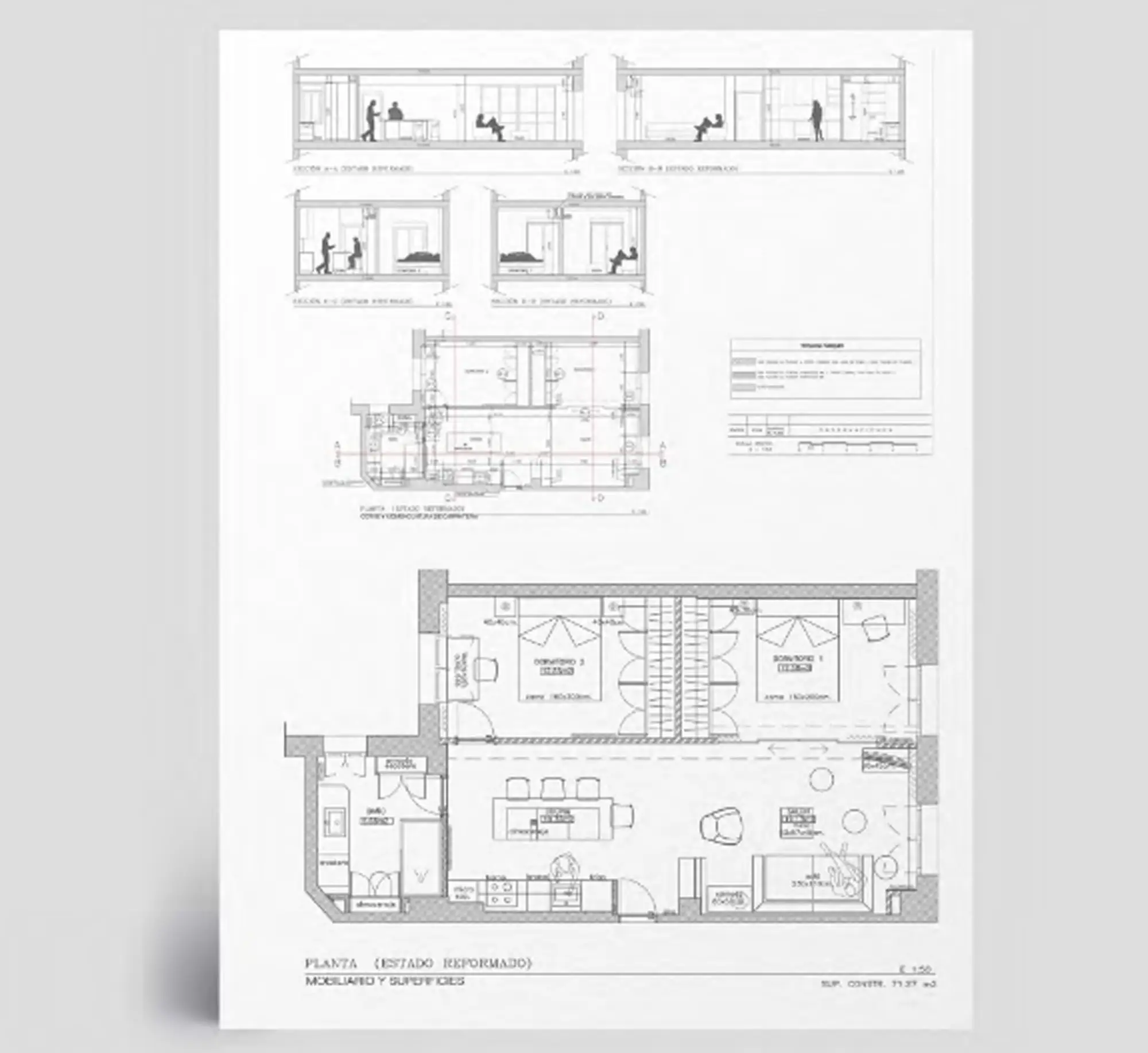 Es objeto de este proyecto Básico y de Ejecución, la reforma integral de una vivienda que no había sido reformada desde el 1963, año en la que se construyó. La vivienda presentaba una distribución antigua, con pequeñas estancias a las que se accedía desde distribuidores y pasillos, dejando el baño y la cocina sin luz ni ventilación natural. Respondiendo al programa de necesidades propuesto por la propiedad, se distribuye la casa de una manera más contemporánea y sencilla. Maximizando espacios y economizando la obra. Se divide el espacio por la mitad, dejando en primer término un espacio abierto de cocina-comedor-salón, abierto al ventanal de fachada, dotando a todo el recinto de luz y ventilación natural. Desde este espacio, se accede a dos dormitorios. Uno abierto mediante una gran puerta corredera de vidrio al salón y con vistas a la calle y el otro, con ventana al patio de manzana. Los núcleos húmedos, cocina y baño se sitúan al fondo y próximos a las bajantes existentes.