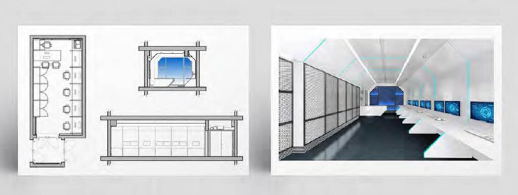 Al ser la planta existente un rectángulo que no permite jugar con sus características y condicionados por las vigas de cuelgue e instalaciones vistas. Se opta por sacar el máximo partido a la sección, creando un espacio unitario, luminoso, técnico y que oculta el caos de instalaciones y elementos estructurales que inundan la parte superior del recinto. Se generará un fondo, que dotará a este espacio de una profundidad y contraste, que romperá la sensación de constreñimiento. El mobiliario se extiende por los paramentos y el techo, logrando así una unidad espacial en color blanco.
